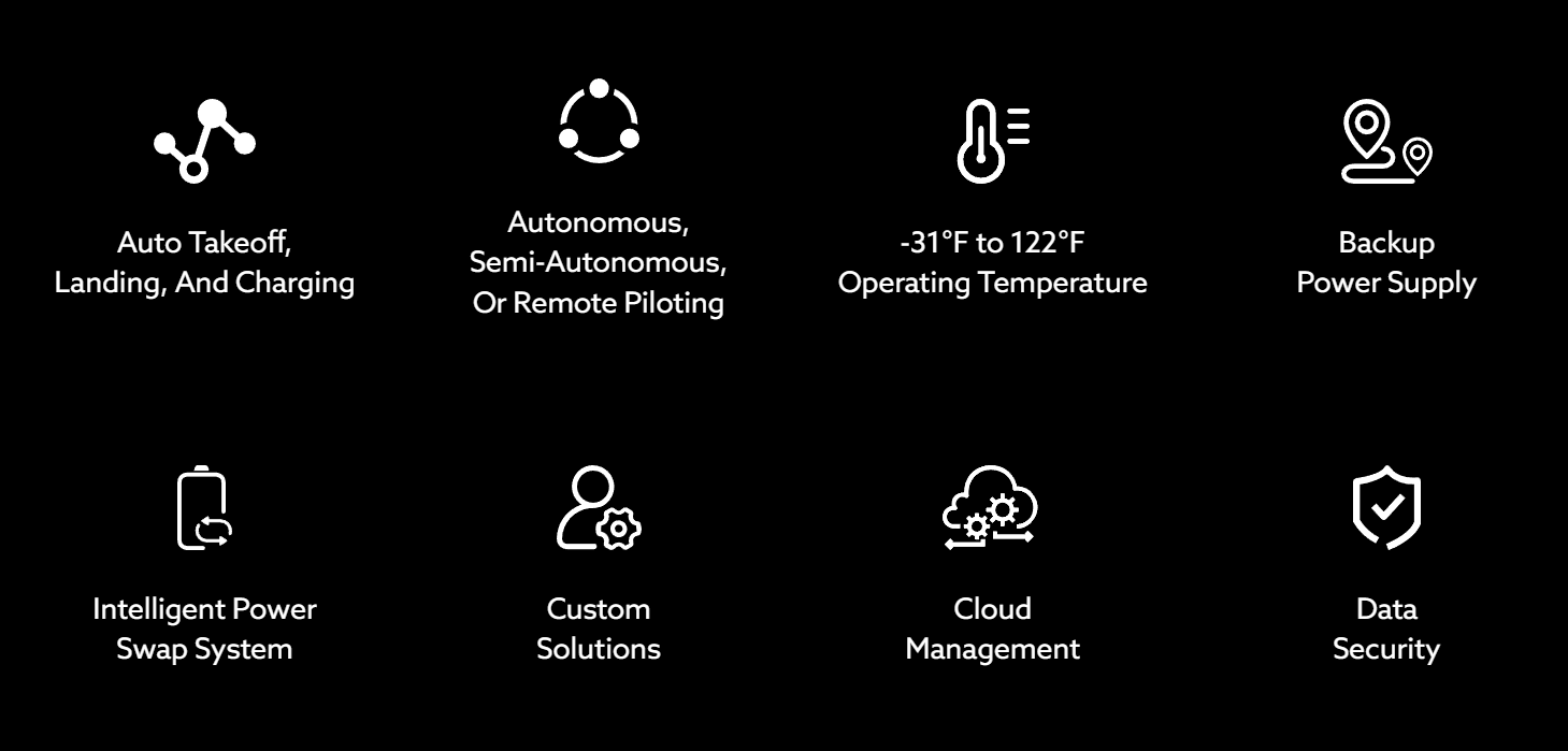 TheVoltaris Remote Operations System consists of the Dragonfish, Dragonfish Nest, Dragonfish Repeater (optional), and Voltaris Integrated Command System to provide a full end-to-end solution for hands-off drone operation management.