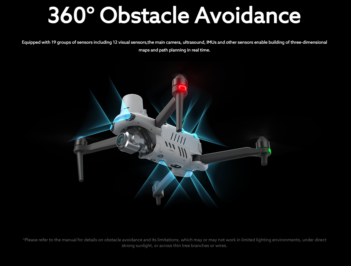 * Regarding flight time, the data is obtained under conditions with no wind or other flight interferences, with the aircraft's obstacle avoidance behavior set to braking mode, and the camera performing photo capture only. The aircraft flies continuously at 8 m/s at sea level until the battery reaches 0% capacity. This data is for reference only. To ensure flight safety, users should closely monitor the App's notifications during actual flight operations.